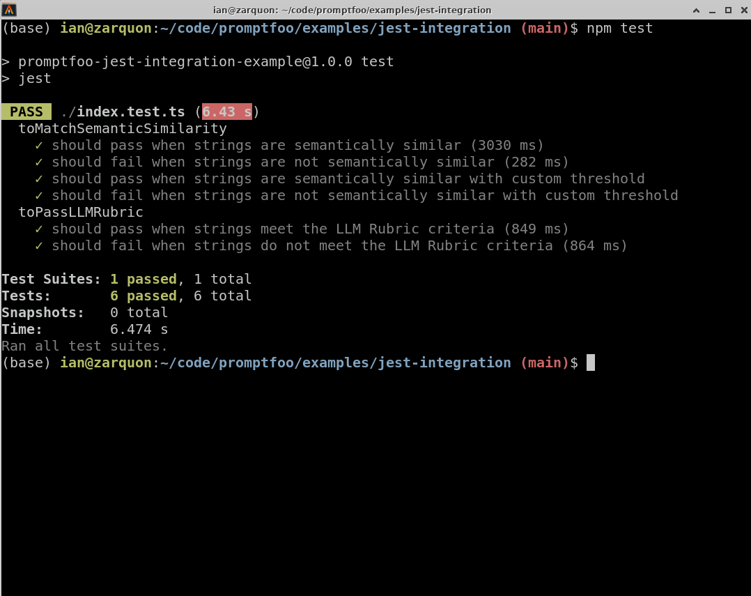 This guide includes examples that show how to create Jest test cases for desired prompt quality using semantic similarity and LLM grading. You can also skip to the full example code.